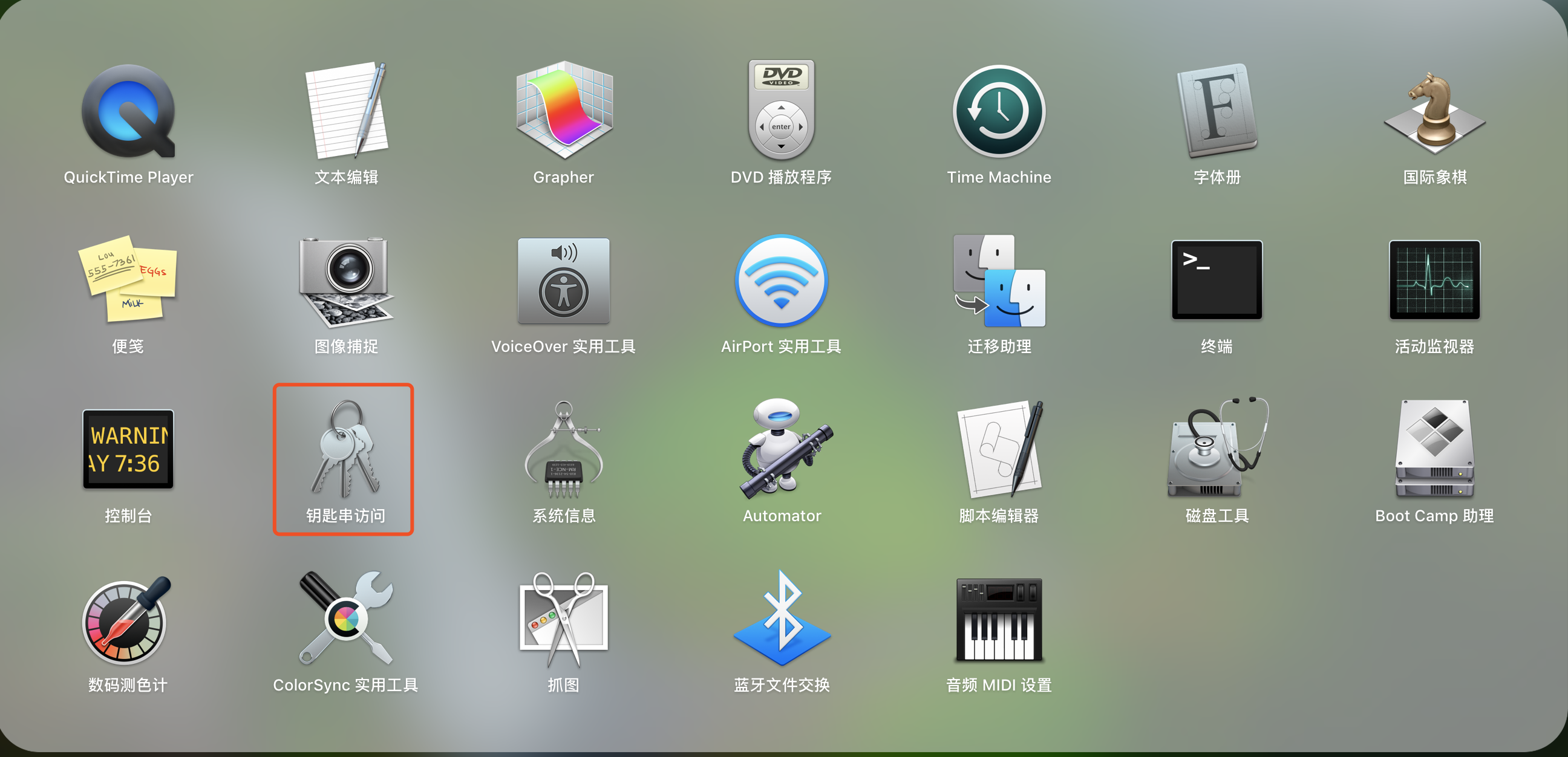 (1) 去Launchpad-->其他中找到 “钥匙串访问” 点击钥匙图标