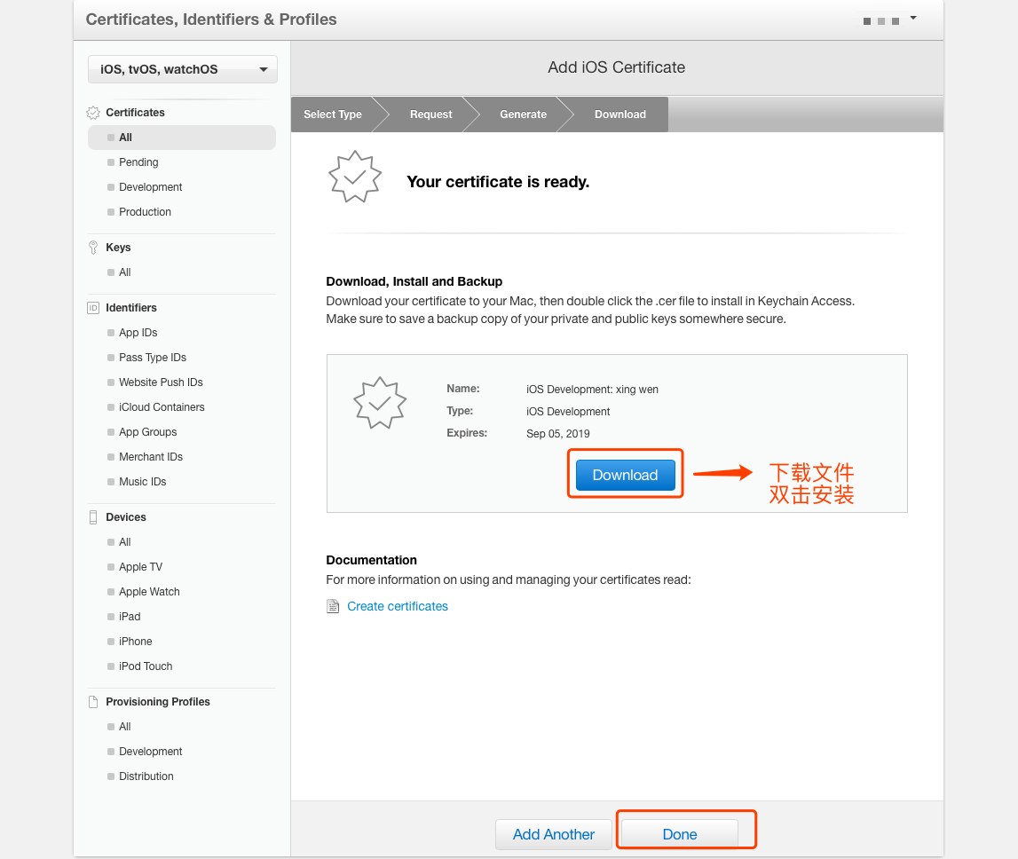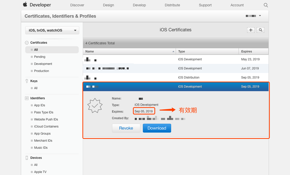 提交上去后就会生成一个cer证书,如图所示,有效期为一年;证书可不轻易删除,可能会造成十分严重的后果(尤其是企业级的发布证书,删除后已经安装在手机上的APP将会闪退,无法使用)。会造成相应的Provisioning Profiles失效,如果是一个团队大家都在用,你把这个证书删除了,会导致别人的描述文件失效。所以不提倡删除。