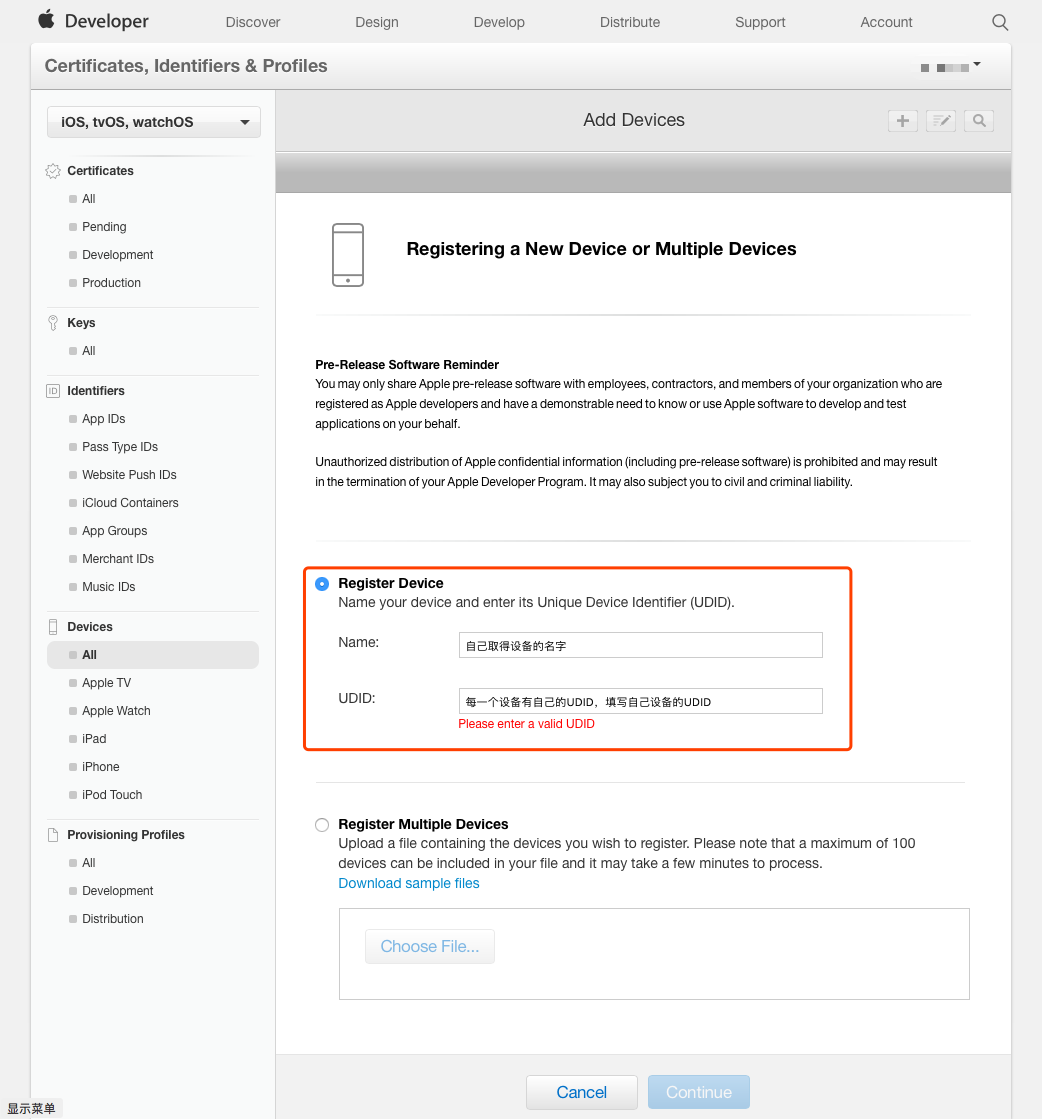 Name 自己取一个设备的名字,UDID约等于设备的身份证,可以在iTunes中查看