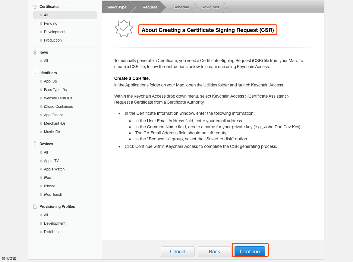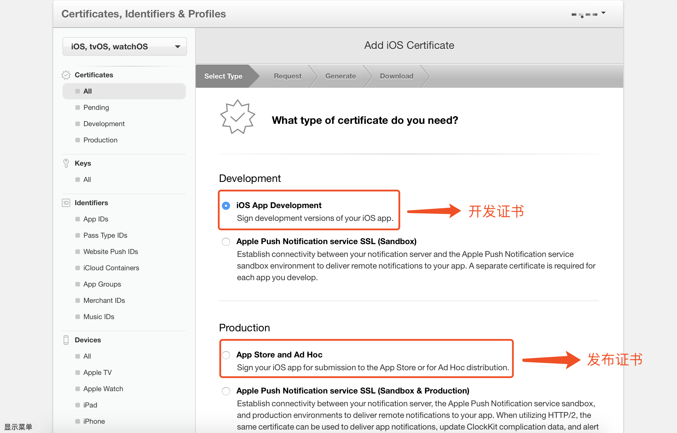 会出现以下界面,该操作重复两次,分别创建开发测试证书和发布证书,开发测试证书用于真机调试,发布证书用于提交到appStore,我们以开发证书为例,选择第一个红框中的内容;