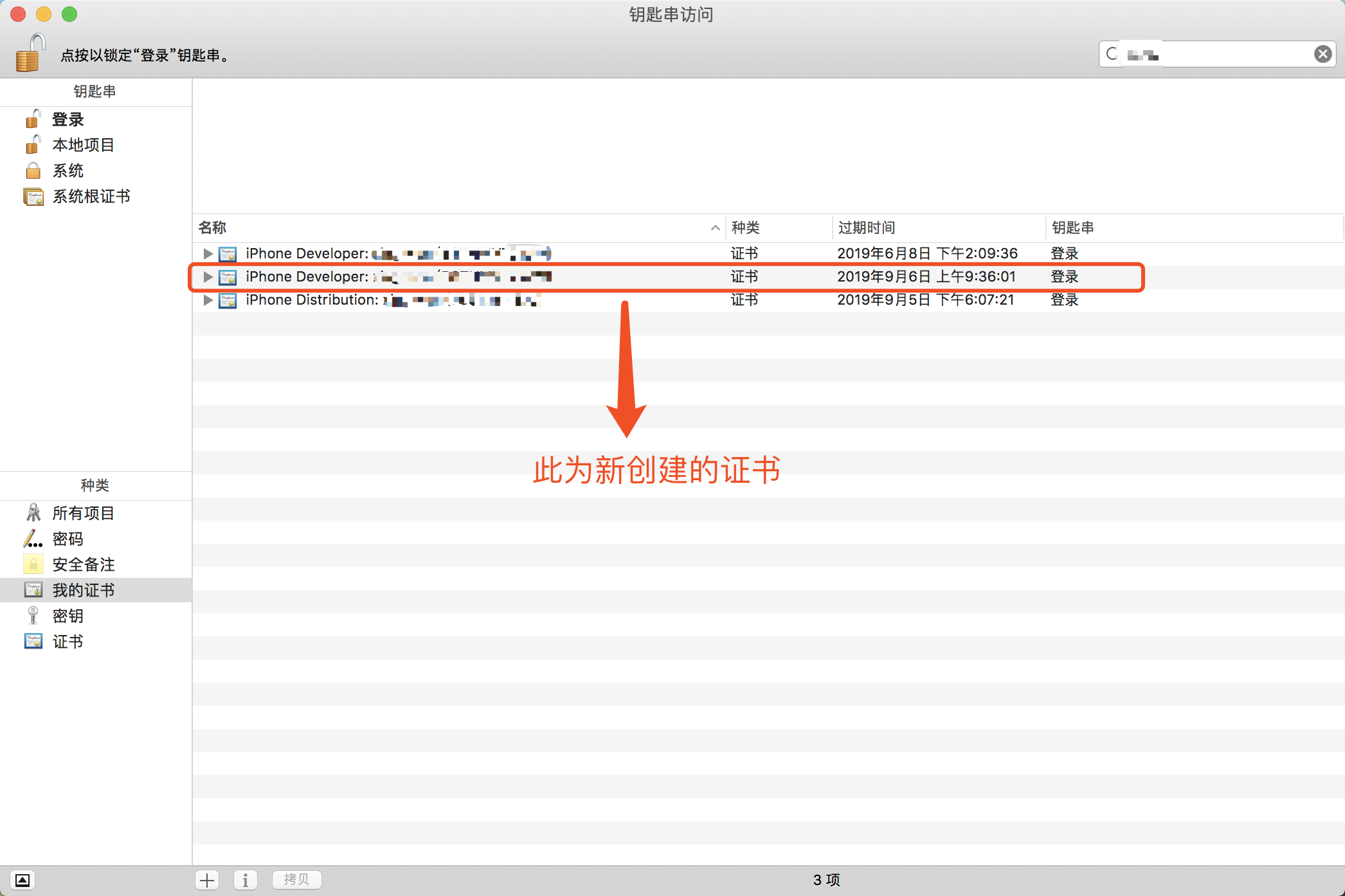 利用同样的方法配置一下Distribution发布证书,下载保存,双击安装;在钥题串登录-我的证书中可以查看