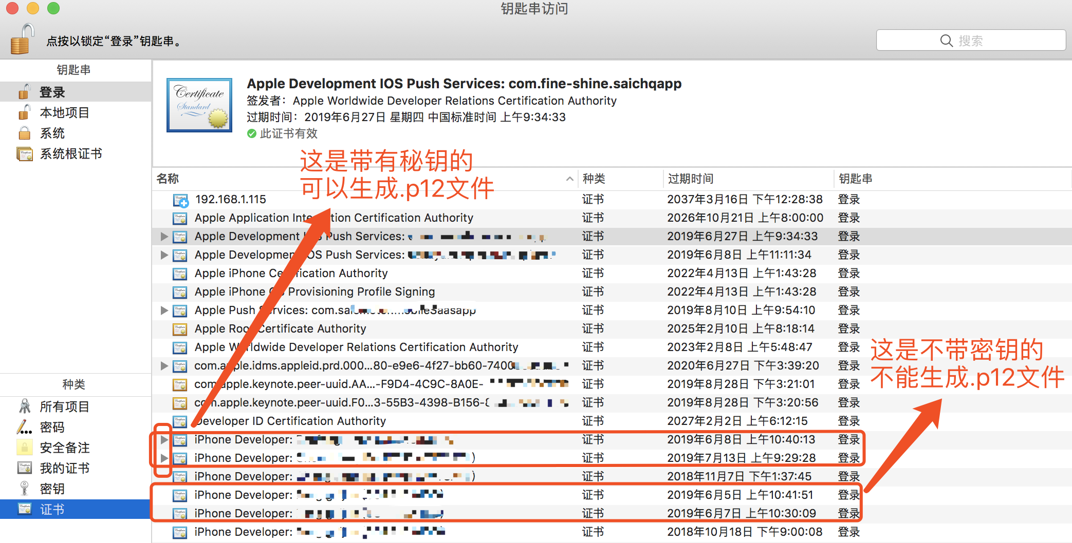 注意:一般.p12文件是给与别人使用的,本机必须已经有一个带秘钥的证书才可以生成.p12文件,如图: