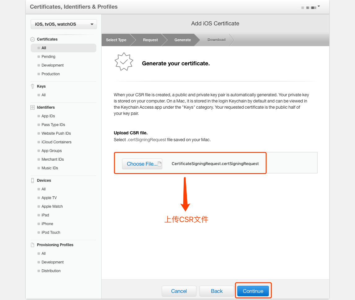 然后下一步,会提示创建CSR文件,也就是证书签名请求文件,会有很详细的操作说明,如果英文不太好,可以参考下图;