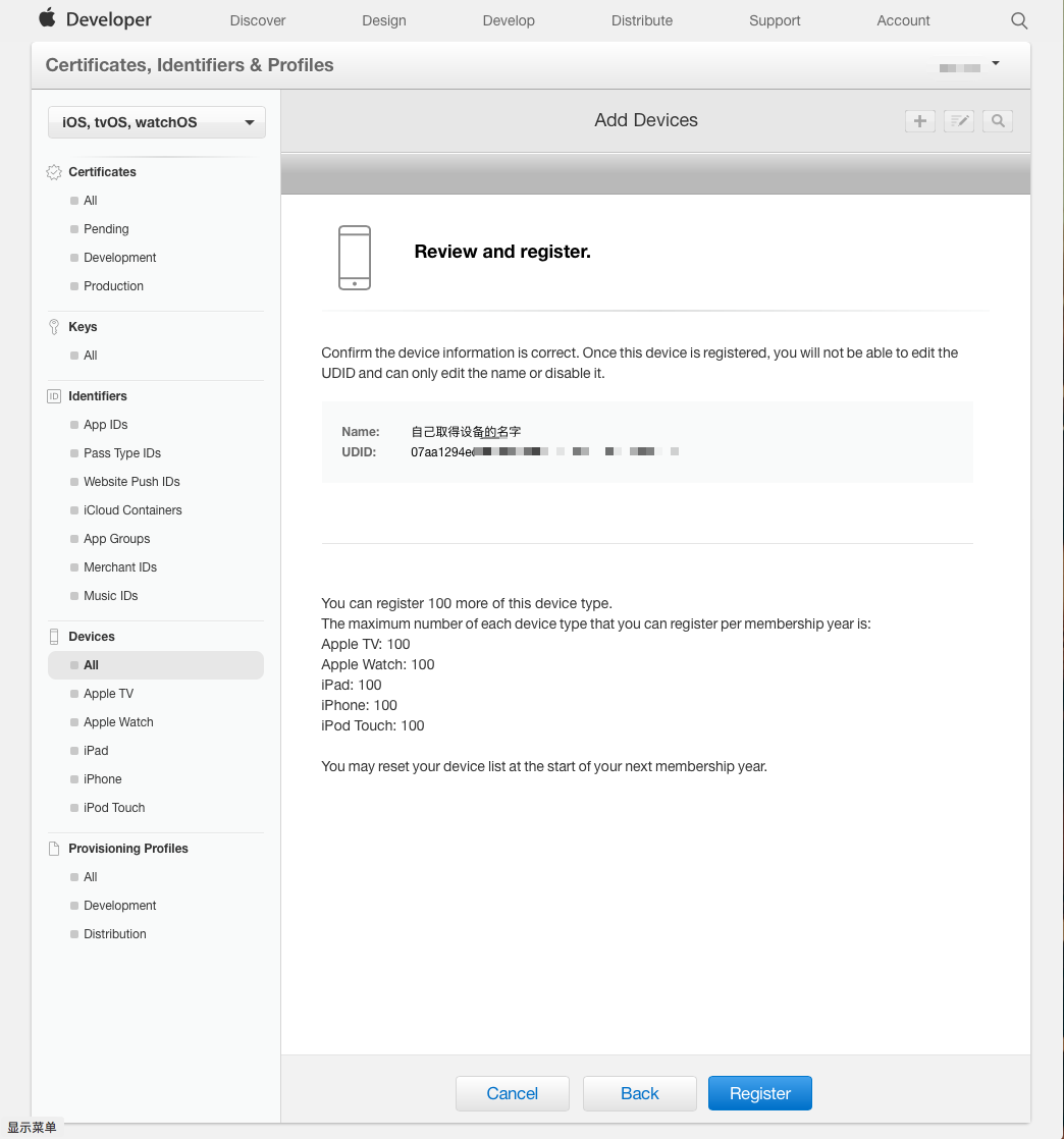 填好 name 和 UDID后,点击continue 就可以看到如下界面,点击“Register”就可以在苹果上登记了。