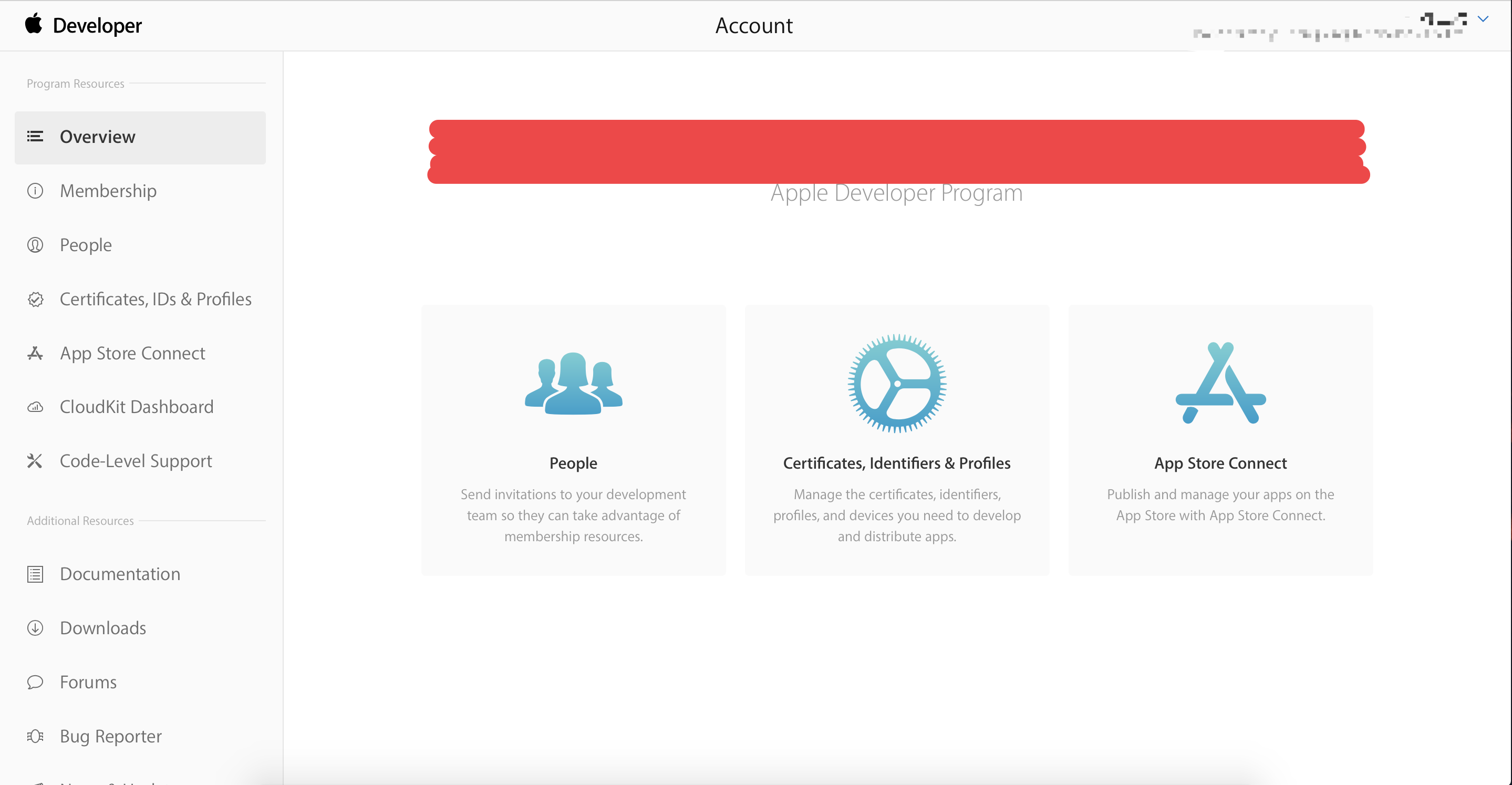 B:公司级:登录后的页面如下图:红色马赛克下方是:Apple Developer Program,再下方,有People、Certificates,identifiers&Profiles和App Store Connect三个图标,第一个图标邀请其他开发人员的入口,第二个图标是开发者证书、App ID和描述文件生成的入口,第三个图标是将APP上传到App Store的入口。