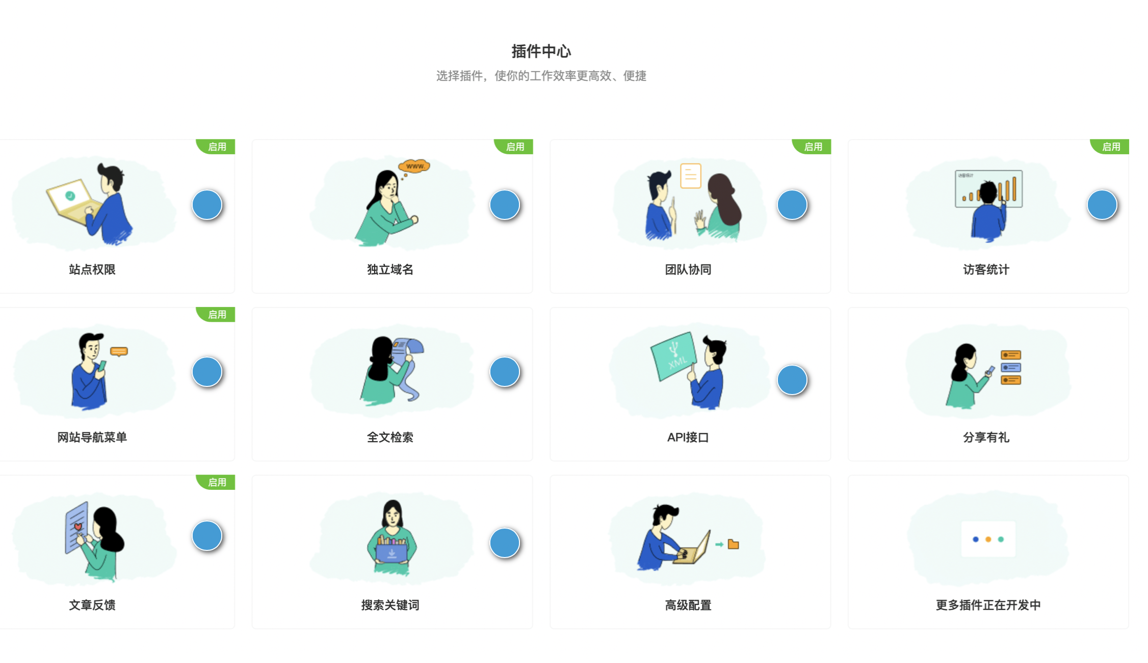 这是一款SaaS软件,所以有很多功能做成插件的形式,用户可以根据需求开通。现在包含的插件有团队协同、站点访问权限、访客统计、导航菜单、全文检索、API接口、文章反馈...下面我挑选几个常用的功能说。
