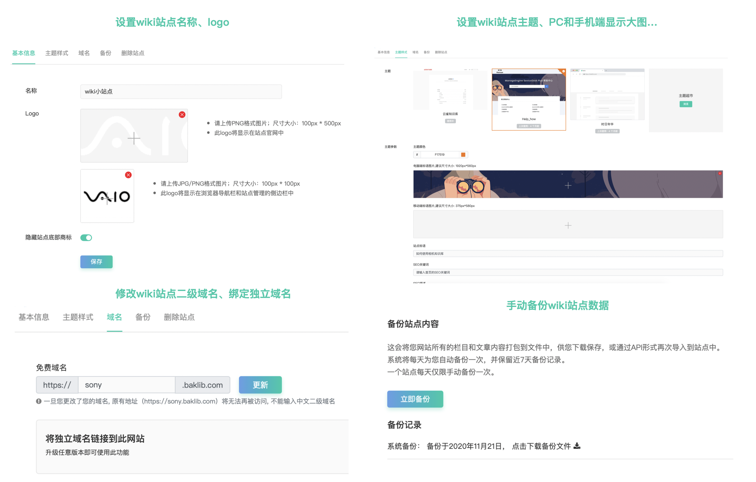 进入操作台点击左侧的设置按钮,即可设置wiki站点的基本信息、主题样式、域名、备份信息、删除站点等5大操作修改完后记得点击保存