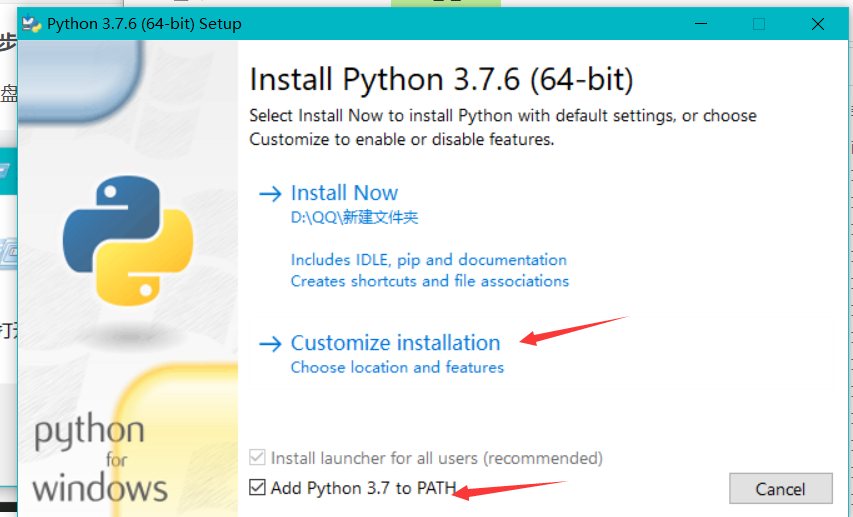 2.选择“Customize Installation”,并且勾选正下方的“Add Python 3.7 to PATH”