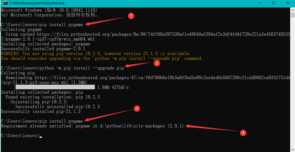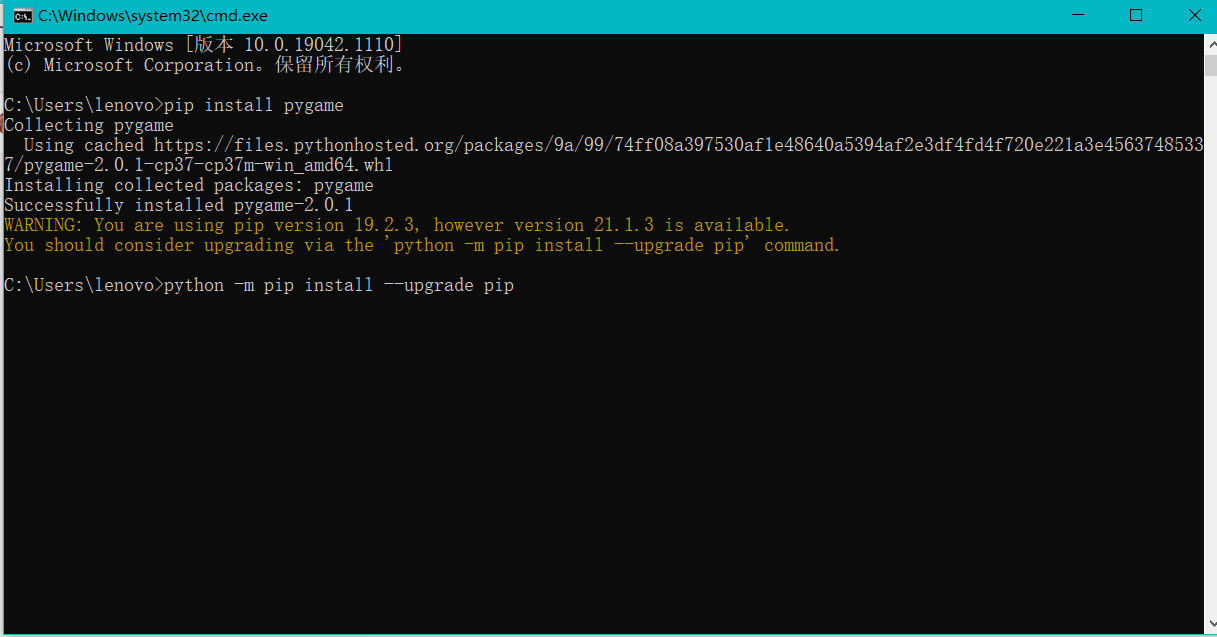 3.待其安装完成后,再输入“pip install pygame”即可。