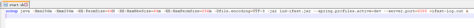 内容如下:nohup java -Xms256m -Xmx256m -XX:PermSize=64M -XX:MaxNewSize=64m -XX:MaxPermSize=256m -Dfile.encoding=UTF-8 -jar lud-ifast.jar --spring.profiles.active=dev --server.port=8088 >ifast-log.out &