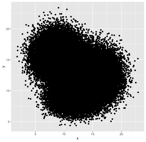 > b <- data.frame( x=rnorm(30000, 15.5, 1.9), y=rnorm(30000, 12.5, 1.9) )