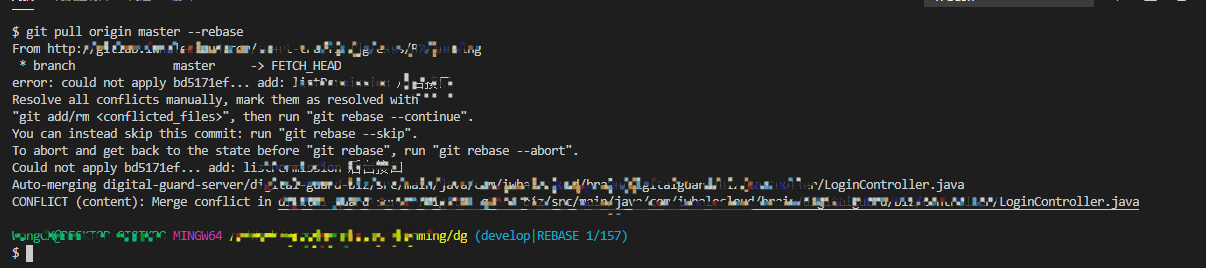 3、但是如果代码有冲突(别人和你修改了同一行代码,导致git不能自动合并),你会发现执行完之后本地版本变成了:develop|REBASE 1/157,类似于这样的,说明rebase失败了,命令会提示哪些文件没有rebase成功,你需要手动将这些冲突合并。