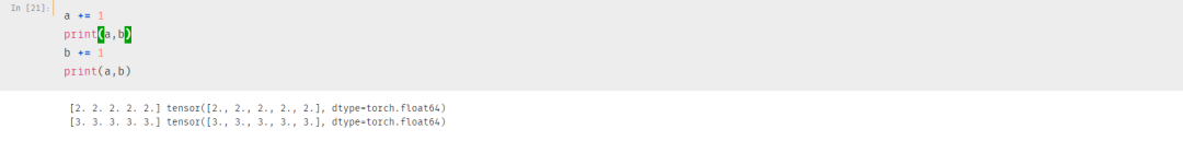 我们很容易⽤ numpy() 和 from_numpy() 将 Tensor 和NumPy中的数组相互转换。但是需要注意的⼀点是:这两个函数所产生的的 Tensor 和NumPy中的数组共享相同的内存(所以他们之间的转换很快),改变其中⼀个时另⼀个也会改变!!!