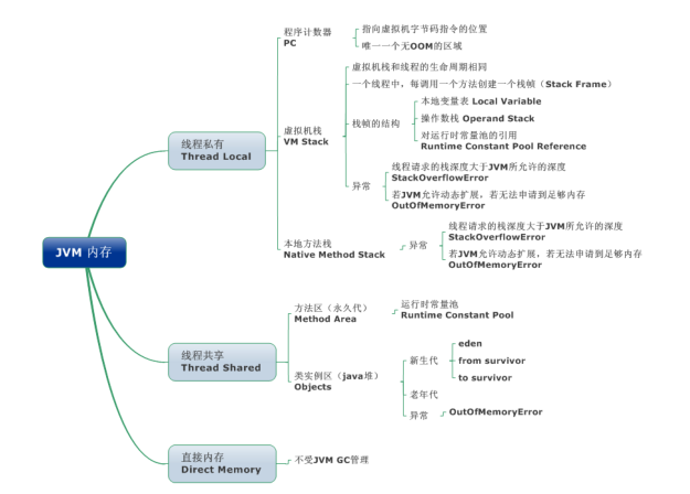 JVM 内存区域主要分为线程私有区域【程序计数器、虚拟机栈、本地方法区】、线程共享区域【JAVA 堆、方法区】、直接内存。
