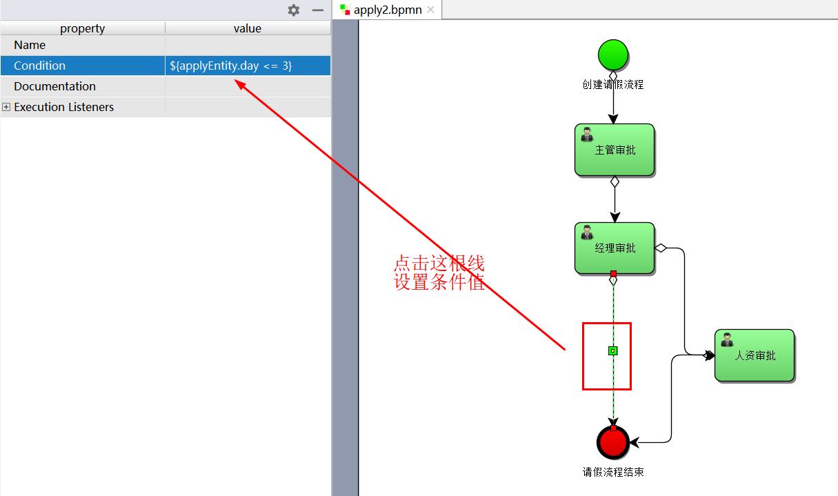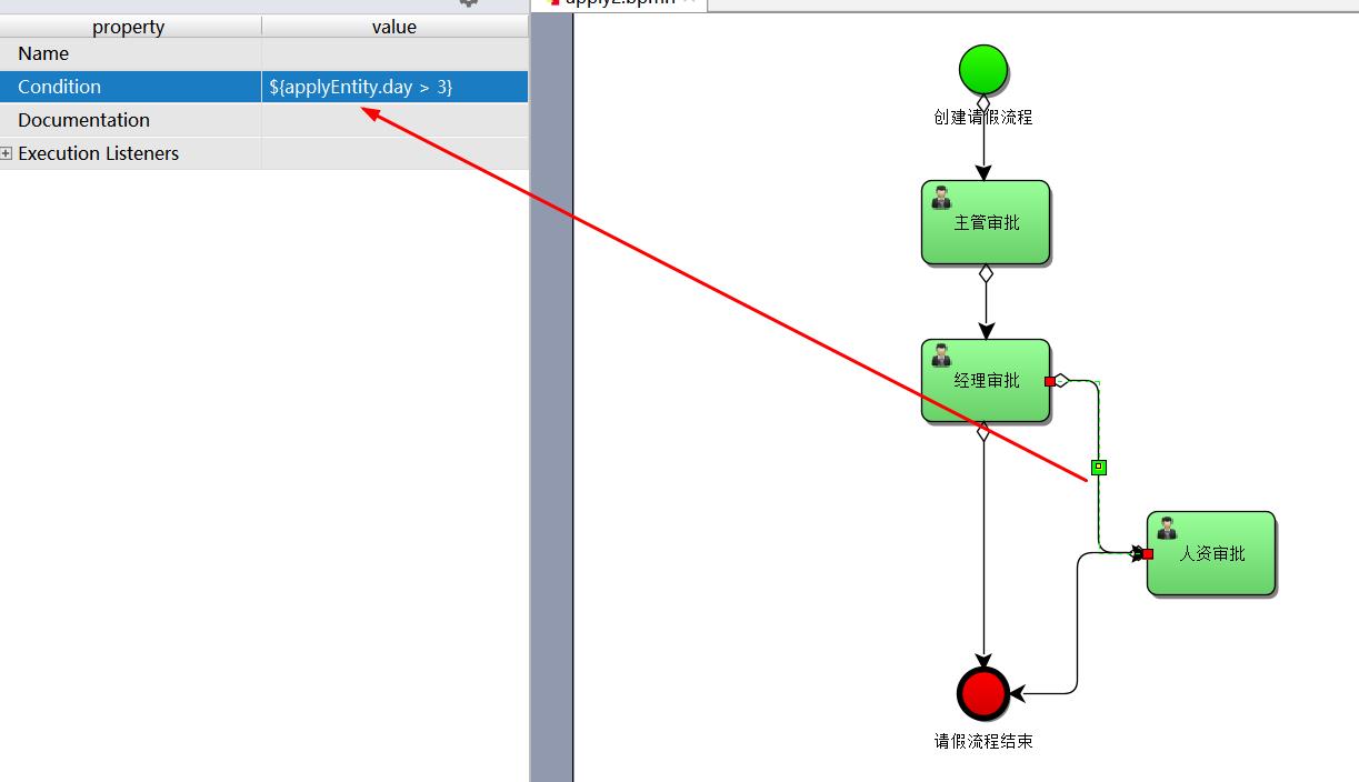 <conditionExpression xsi:type="tFormalExpression"><![CDATA[${applyEntity.day > 3}]]></conditionExpression>