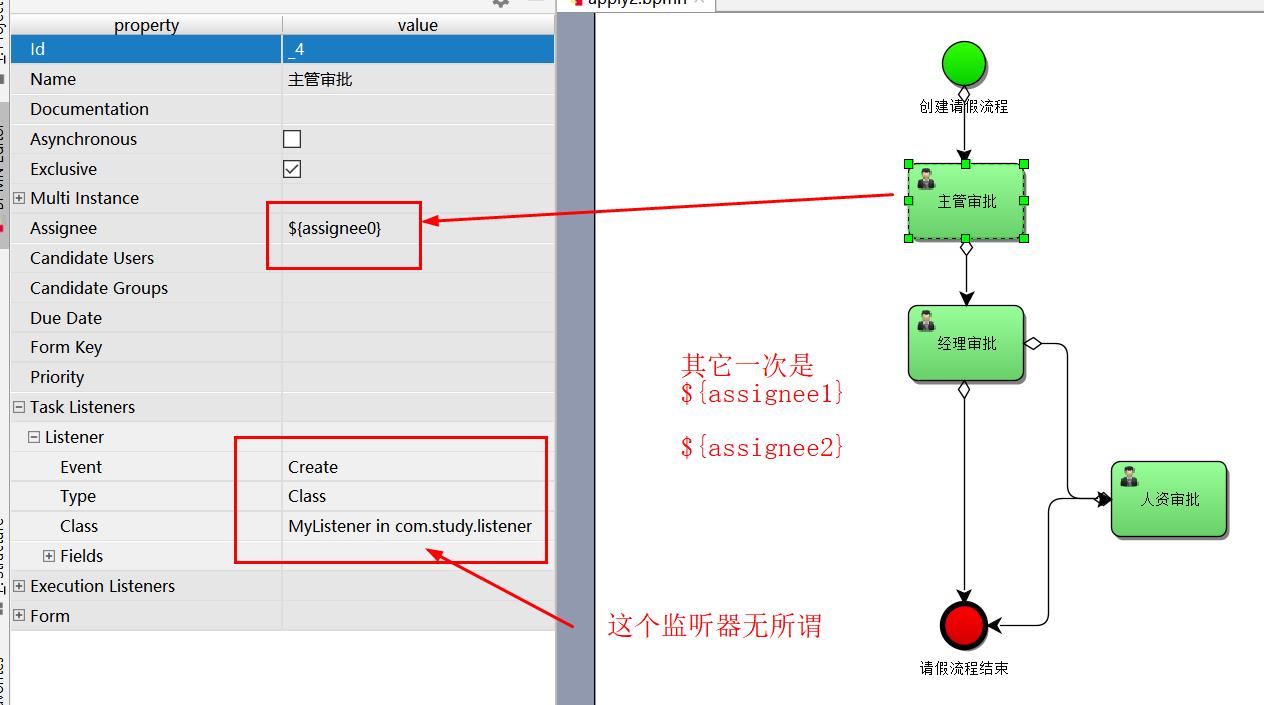 <userTask activiti:assignee="${assignee2}" activiti:exclusive="true" id="_6" name="人资审批">