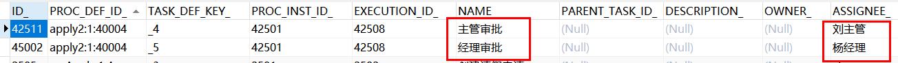 然后流程就到 【杨经理】审批,查看数据库表:act_ru_task