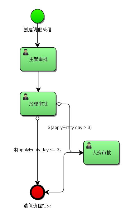 需求:请假流程。员工请假,主管审批,如果在3天内(包含3天),部门经理审批,通过。如果超过3天,还要增加人资审批。