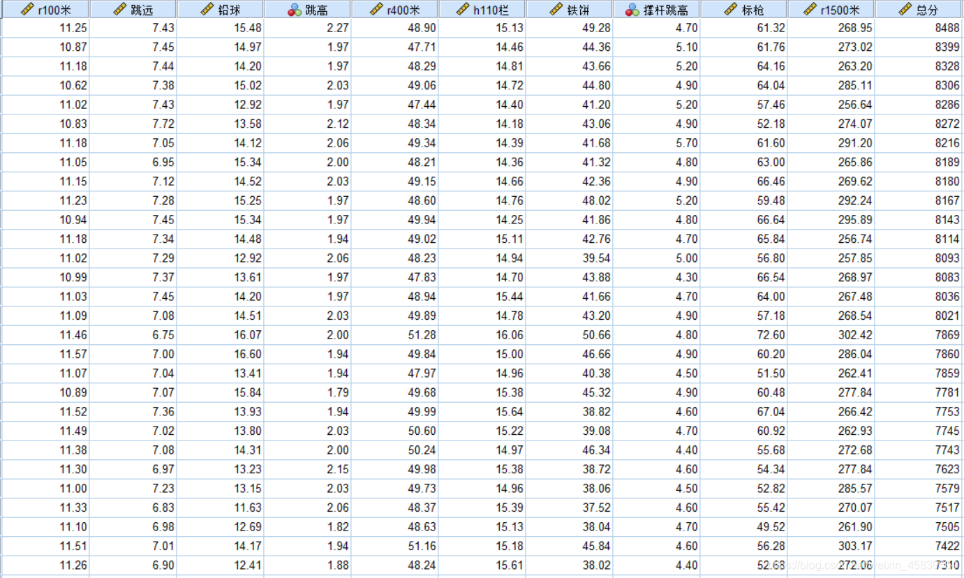 省体工大队打算从一批青年运动员里选择优秀苗子。现在对这批运动员做10个项目的测试,这10个都是田径项目。34个运动员的10个项目的成绩如下。用主成分分析方法对这些运动员的核心能力进行说明。