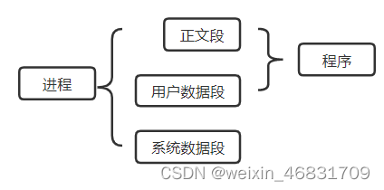 进程包括 正文段、用户数据段、系统数据段,程序属于正文段和用户数据段,系统数据段用来有效的存放程序运行的环境