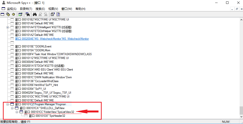 SendMessageTimeout(windowHandle, 0x052c, 0 ,0, SMTO_NORMAL, 0x3e8,(PDWORD_PTR)&result);在执行了上述代码后,重新使用spy获取桌面窗口的信息,得到下图: