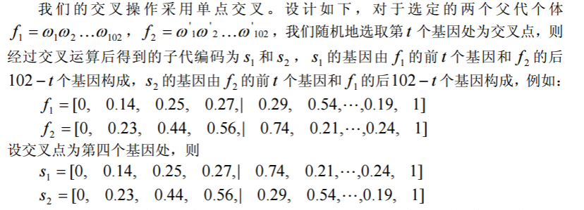 交叉操作的方式有很多种选择,我们应该尽可能选取好的交叉方式,保证子代能继 承父代的优良特性。同时这里的交叉操作也蕴含了变异操作。