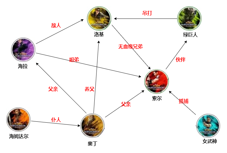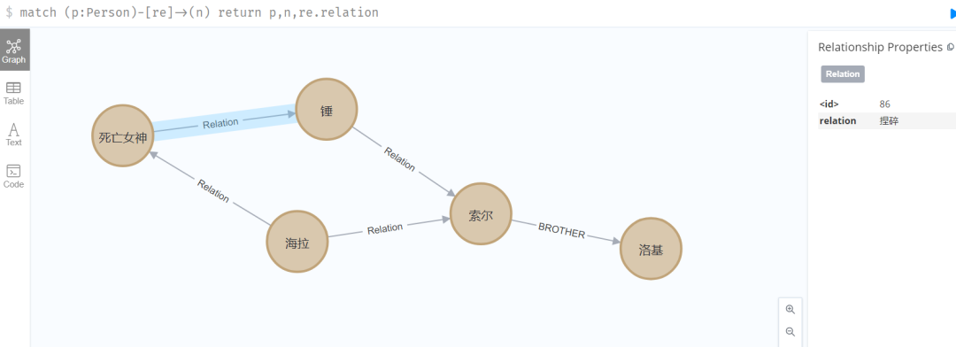 调用完成后,我们再来看看 Neo4j 中的图形关系,可以看到海拉、死亡女神、索尔、锤这些实体被关联在了一起: