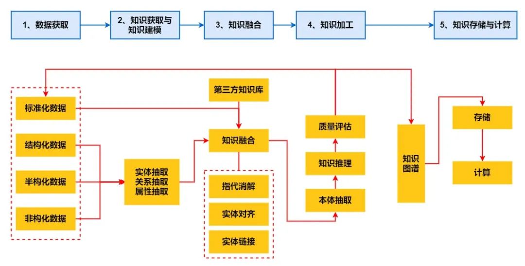 知识图谱的构建目前已有一套比较完善的架构体系,可以先来看一下下面这张图,然后我们再慢慢解释: