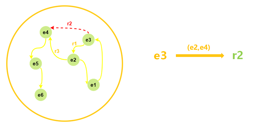 在下面的这张知识图谱的实体网络中,黄色的箭头表示已经存在的关系,红色的虚线则是缺失的关系。我们可以根据实体之间的关系,来补全缺失的 e3 到 e4 之间的关系。