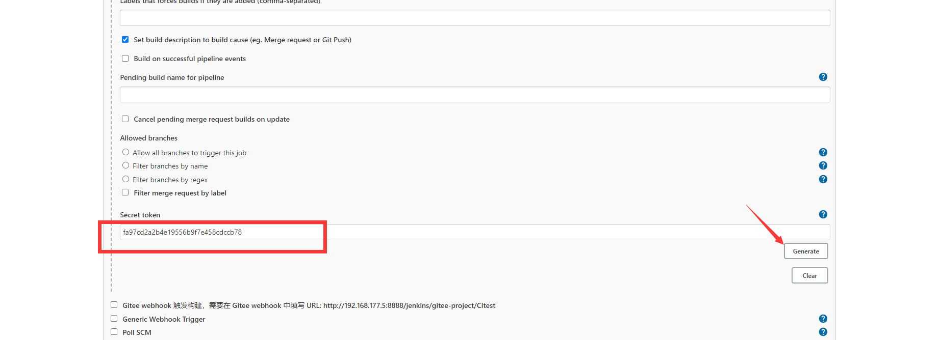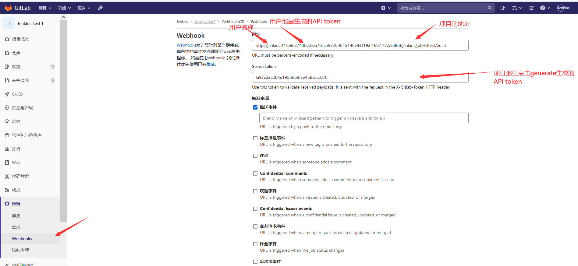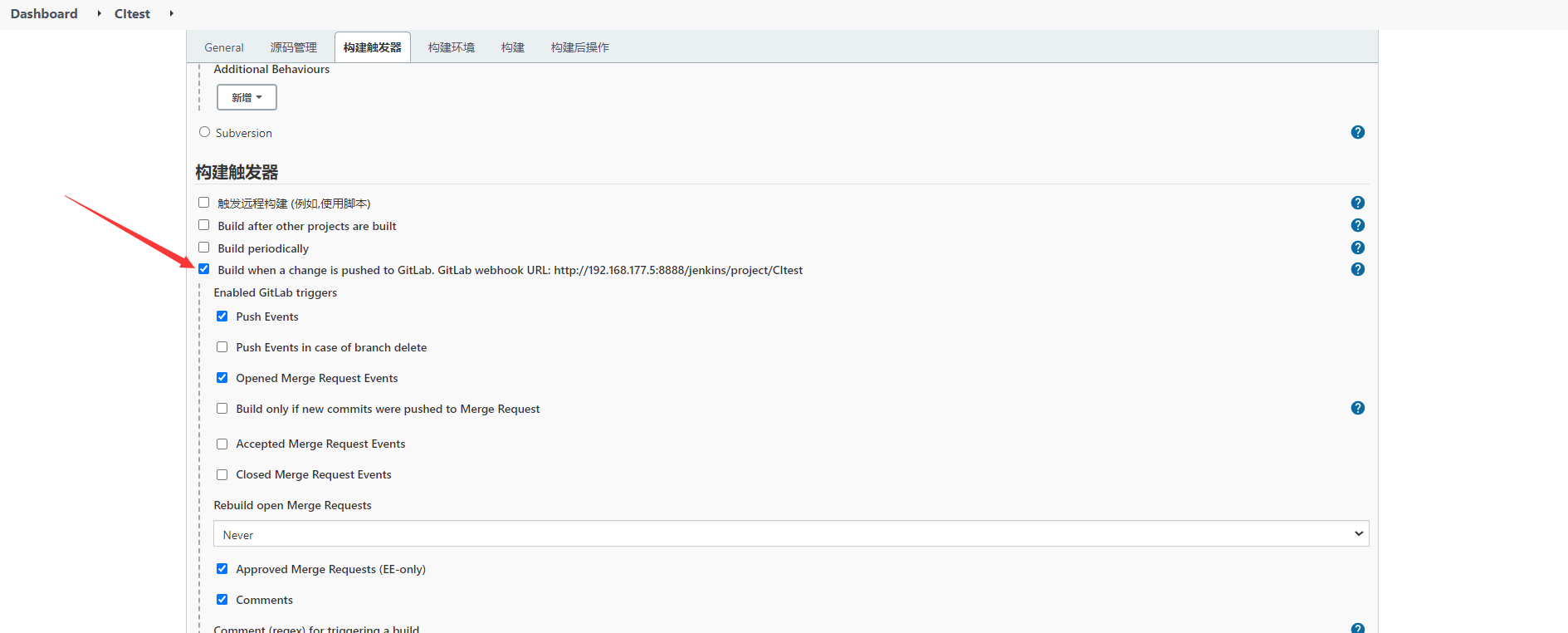 3.3触发器选择Build when a change is pushed to GitLab. GitLab webhook 如果没有这个选项说明插件没安装正确或者没有重启jenkins