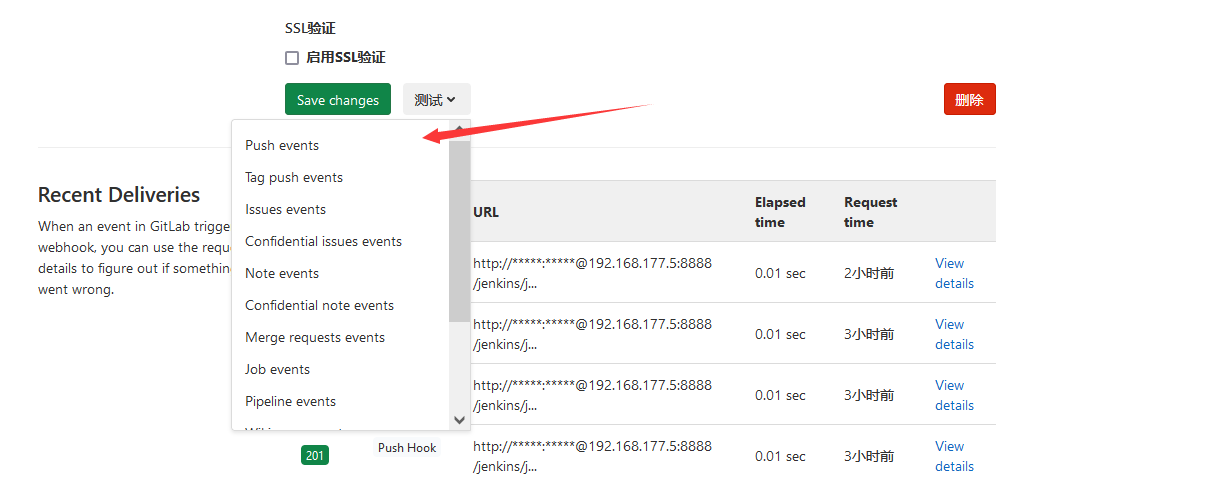 4.2点击push events 模拟提交代码,反馈的是201测试成功