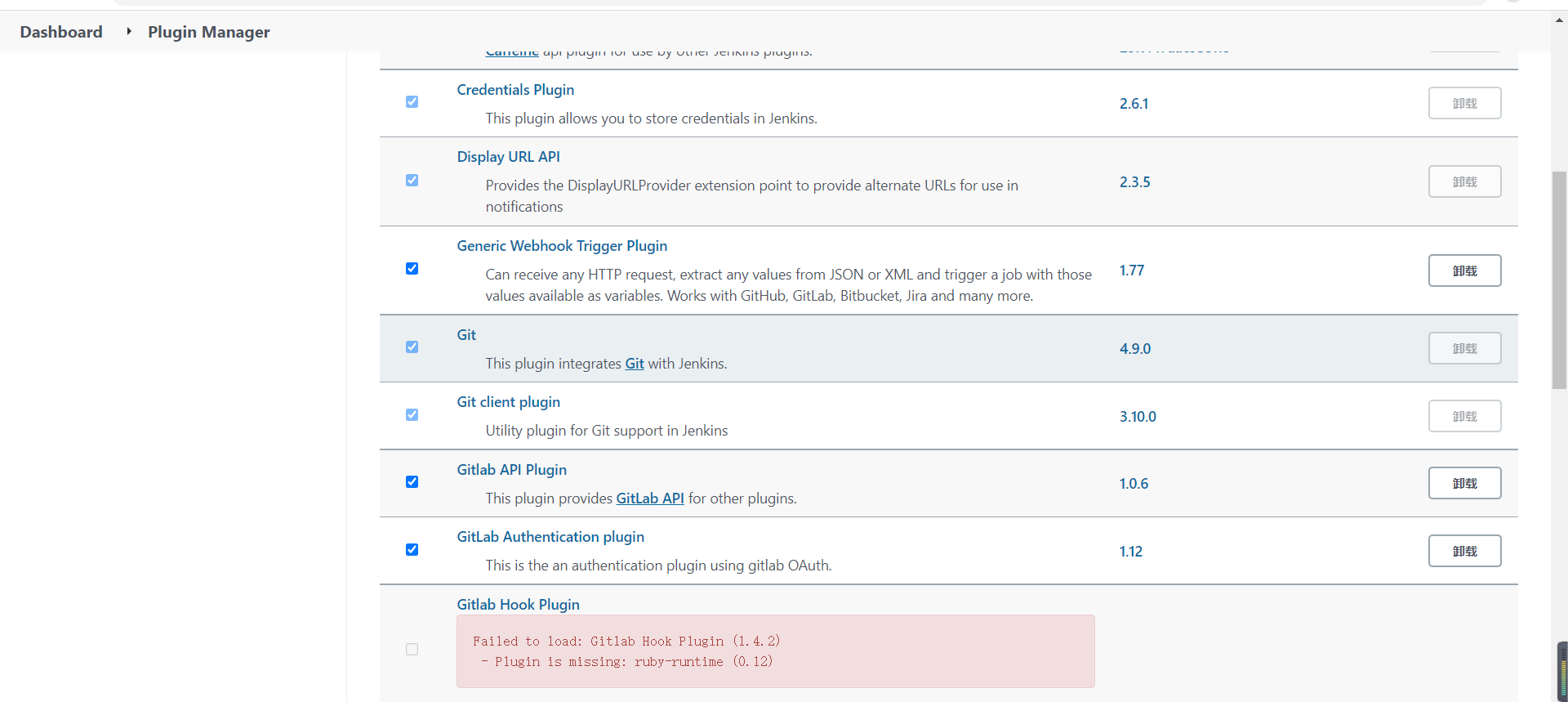 3.1添加Gitlab Hook、Build Authorization Token Root、Gitlab Authentication、Gitlab这些插件如果搜索不到或者版本不兼容请更新jenkins,我是采用war包方式放Tomcat直接部署的,升级的话直接更换war包即可。