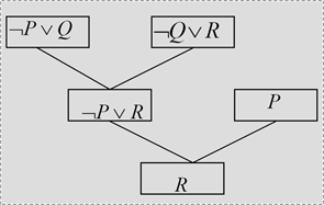 (4)应用归结原理对子句集S中的子句进行归结,并把每次归结得到的归结式都并入到S中。如此反复进行,若出现了空子句(P∨﹁P),则停止归结,此时就证明了Q为真。