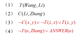 把目标表示成谓词公式,谁教张T(x,Zhang),并把它否定后与 ANSWER 析取: