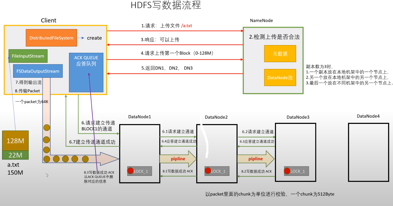 5.client开始往A上传第一个block(先从磁盘读取数据放到一个本地内存缓存),以packet为单位(64k),A收到一个packet就回传给B,B传给C,A没传一个packet会放入一个应答队列等待应答