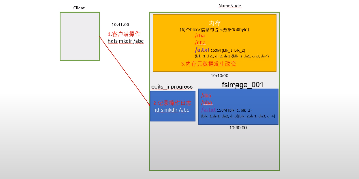 元数据存放在NameNode节点的内存中,客户端的每个操作都访问内存,效率高,响应快,但内存中的数据一旦断电就丢失了