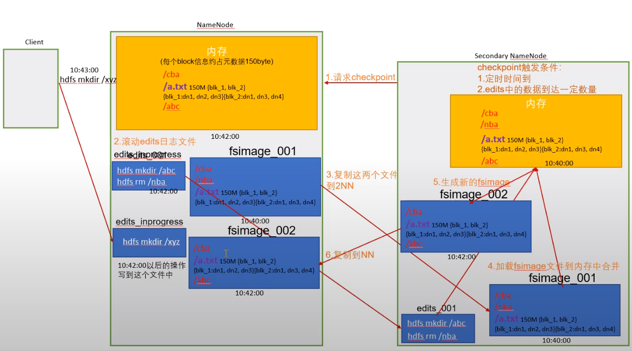 SecondaryNameNode就是来帮助我解决上述问题的,它的职责是合并NameNode的edits到fsimage文件中4.Checkpoint