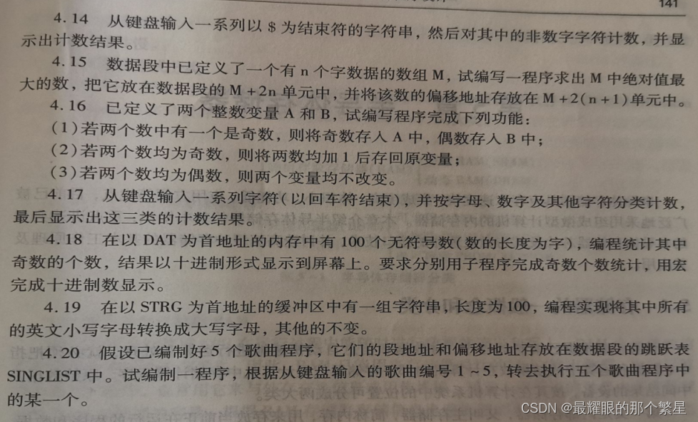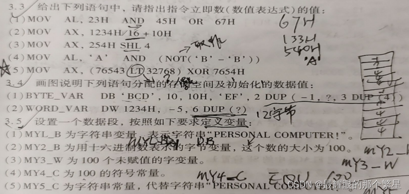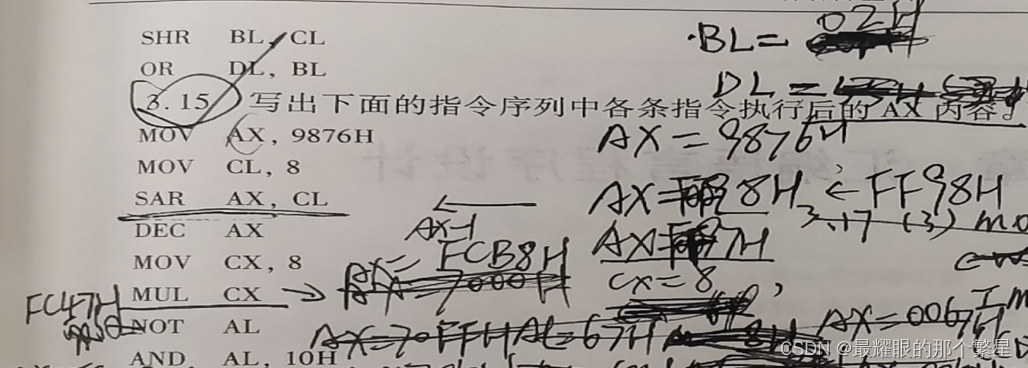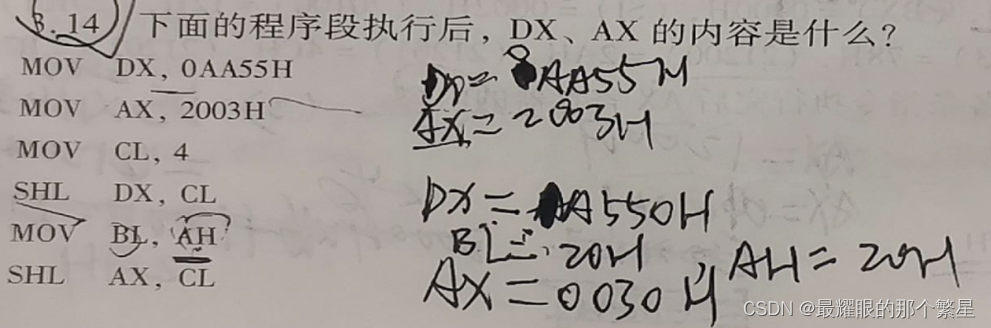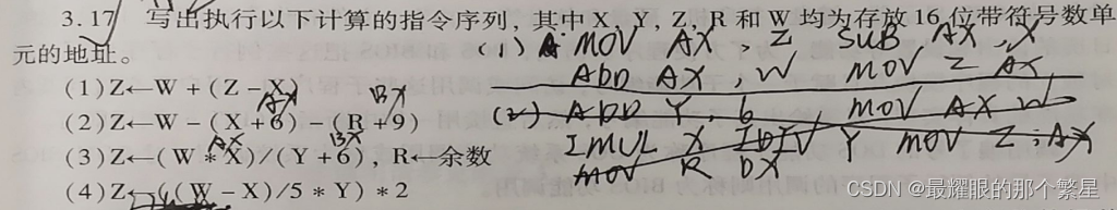 3.17答案:(1)MOV AX,Z;SUB AX,X;ADD AX,W;MOV Z,AX;