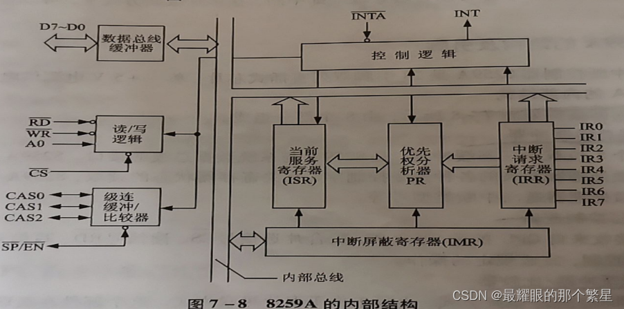 内部结构:①数据内部缓冲器;②读/写控制逻辑;③级联缓冲器/比较器;④中断请求寄存器IRR;⑤中断屏蔽寄存器IMR;⑥中断服务状态寄存器ISR;⑦优先权分析器;⑧控制逻辑。