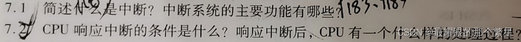 第一问:指CPU正常运行程序时,遇到紧急事件需要处理,引起CPU中断正在进行的程序,而转去处理临时发生的事情,处理完毕,再返回去执行被暂停时中断的程序。