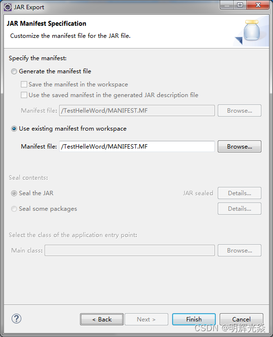 5、勾选“Use existing manifest from workspace”,选择写好的MANIFEST.MF文件