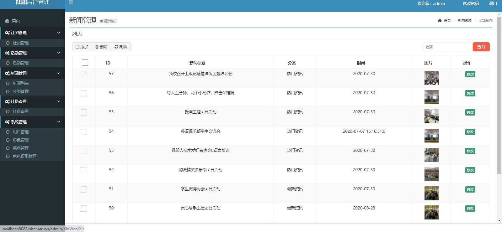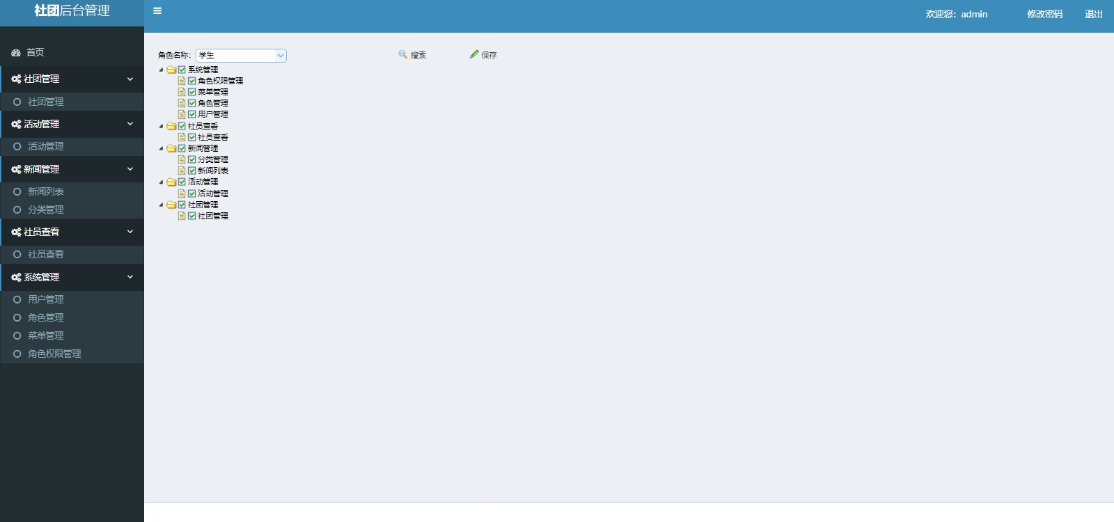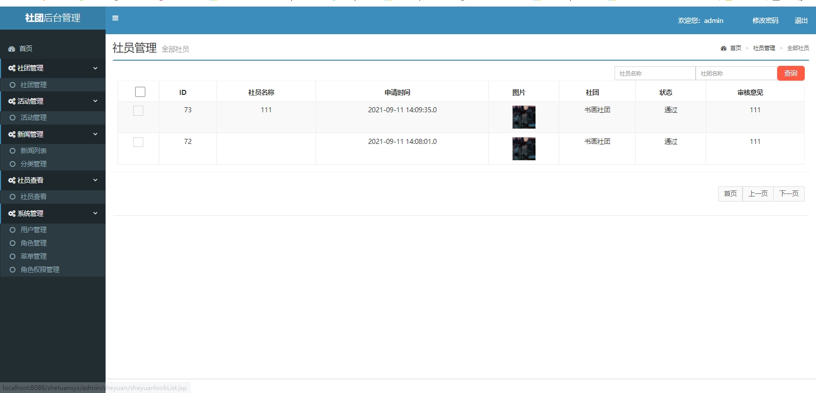 基于Jsp+Servlet+MySql的社团管理系统,包含前后端两个部分,后端整体包含社团管理,活动管理,新闻管理,新闻分类管理,社员管理,用户管理,角色管理,菜单管理,角色授权管理。