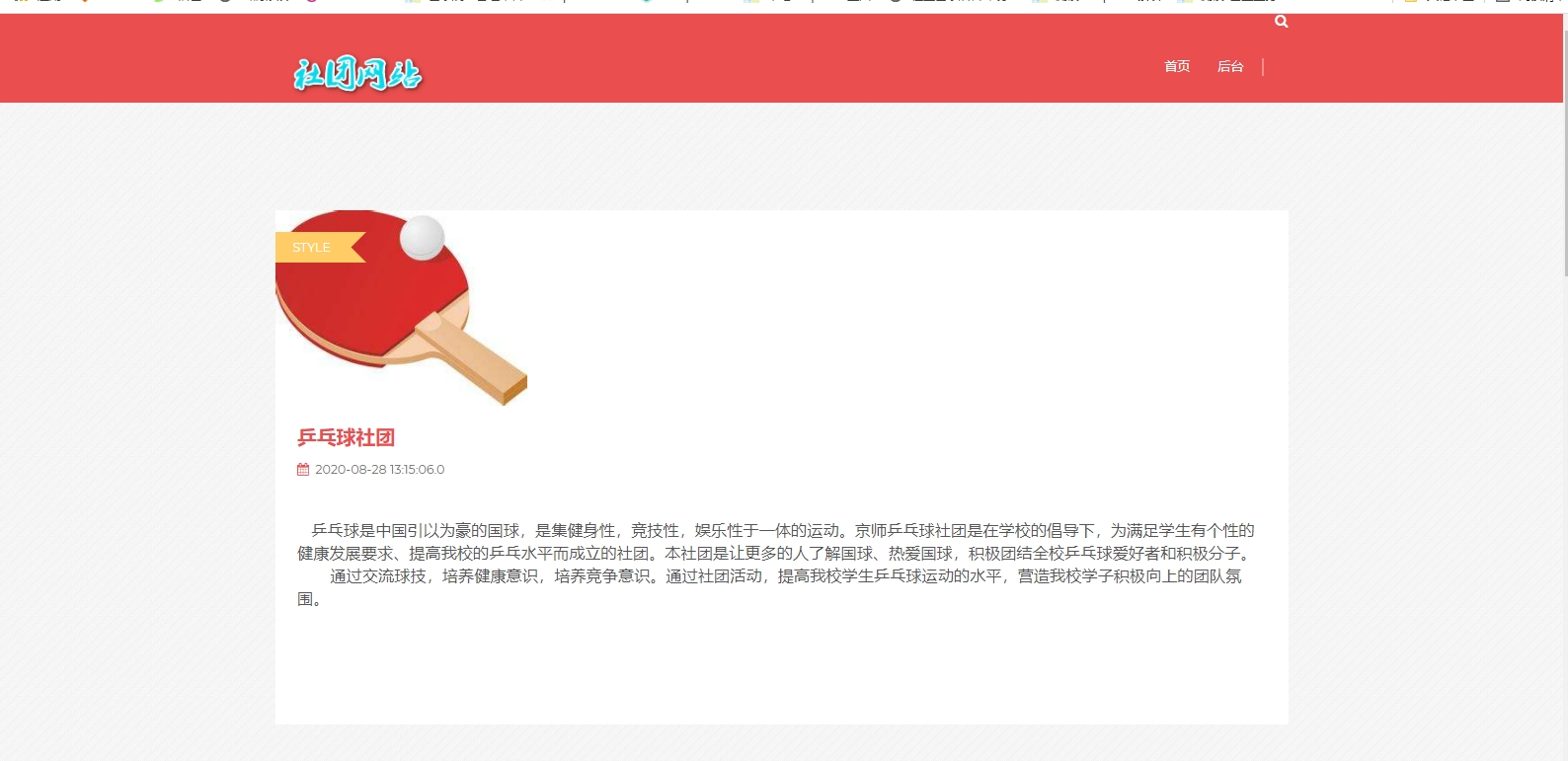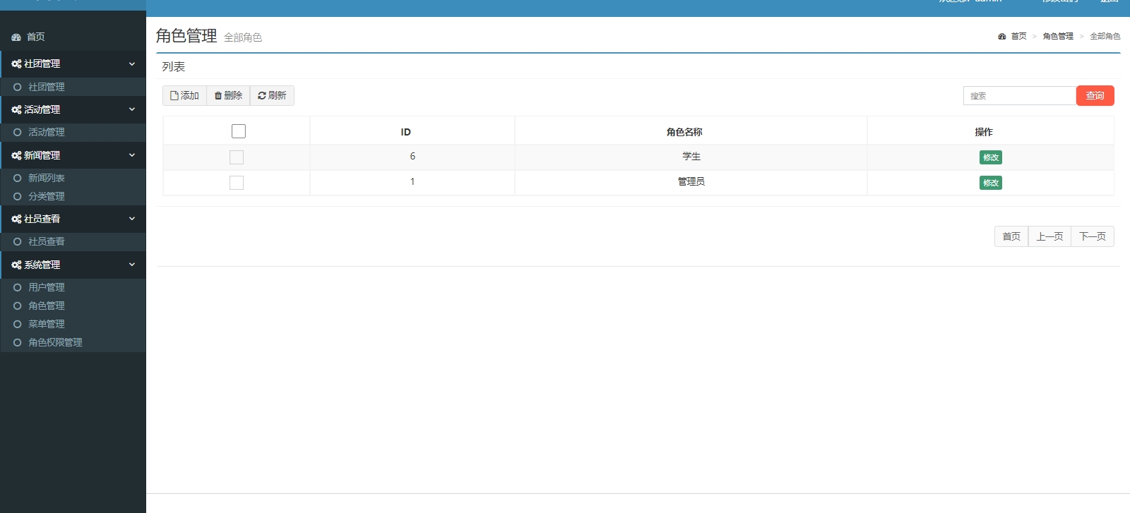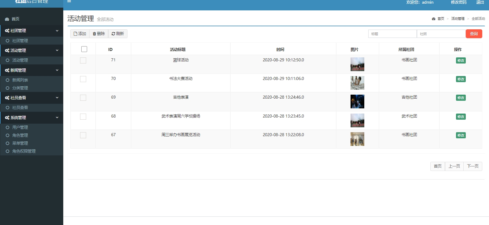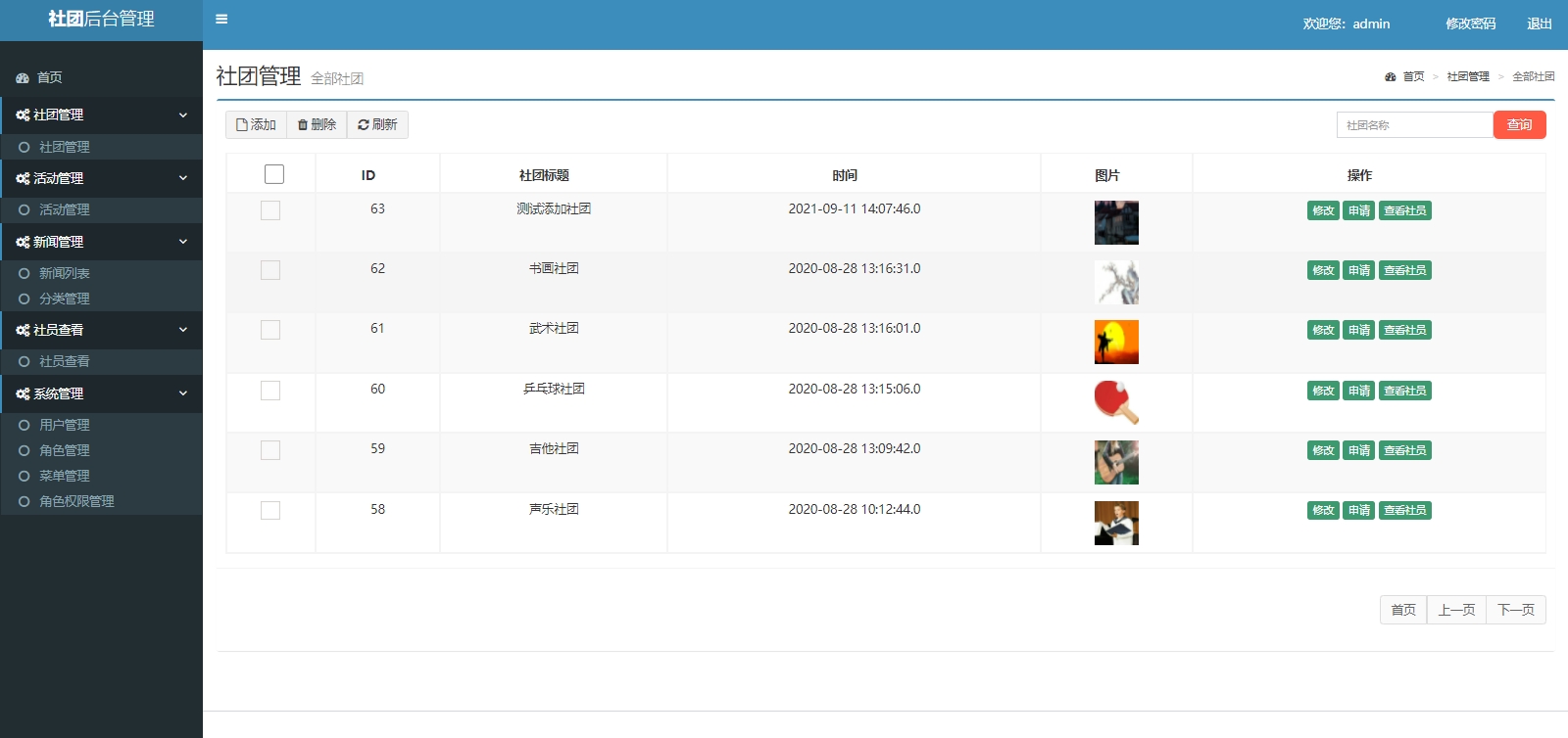 基于Jsp+Servlet+MySql的社团管理系统,包含前后端两个部分,后端整体包含社团管理,活动管理,新闻管理,新闻分类管理,社员管理,用户管理,角色管理,菜单管理,角色授权管理。