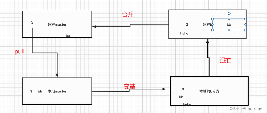 先pull是为了把本地分支更新成与远程主分支一样,变基是为了把本地b分支的功能变成与本地主分支一样,然后本地b分支在推到远程b分支,远程b分支在合并到远程主分支