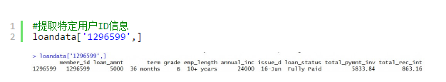 也可以直接输入索引行的名称来提取特定行的信息,下面的代码提取了用户ID为1296599的贷款信息。