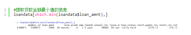 同样的方法也可以用which.min函数来提取贷款金额最小值所在行的信息。