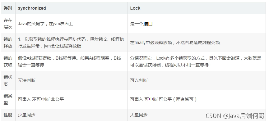 前言:这是Java面试中常常会被问到的问题,特此总结一下。在分布式开发中,锁是线程控制的重要途径,Java为此也提供了两种锁机制,synchronized和Lock。既然有了synchronized,为啥还要提供Lock接口呢?也许你会说Lock接口比synchronized性能高。在jdk1.5之前确实如此,但是在jdk1.6版本synchronized优化之后,两者性能差不多了。