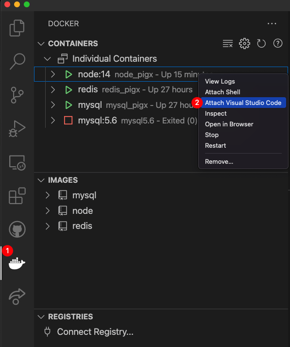 4fedda0913e4 node:14 "docker-entrypoint.s…" 27 hours ago Exited (137) 57 minutes ago node_pigx