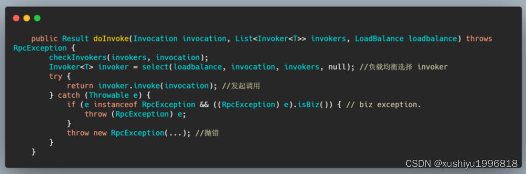从代码可以看到,很简单还是通过负载均衡选择一个 invoker,然后发起调用,如果失败了就抛错。