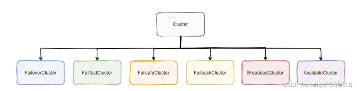 可以看到上面有很多种集群的实现,分别适用不同的场景,这其实就是很好的抽象,加了这个中间层向服务消费者屏蔽了集群调用的细节,并且可以在不同场景选择更合适的实现。